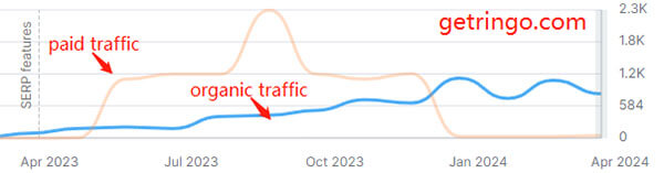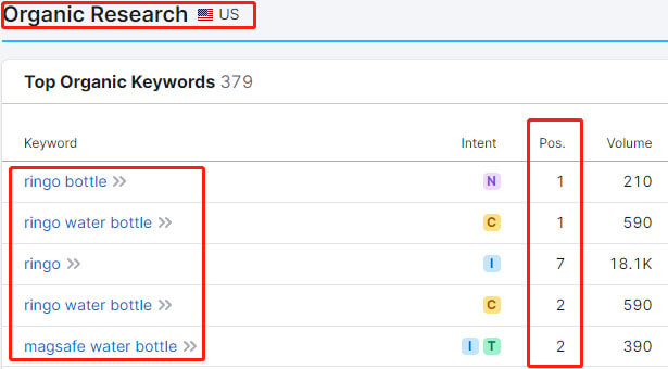 At the very beginning, GetRingo relies on paid traffic. As popularity grows, they gradually shift towards organic traffic. The flagship product “magsafe water bottle” and keywords associated with the brand are generating good organic traffic in the US.