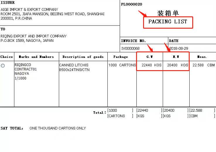 Packing List: Details each package or carton box, including the shipment net and gross weight, helping with customs inspections and buyer verifications. Here is a packing list sample with the net and gross weight info.